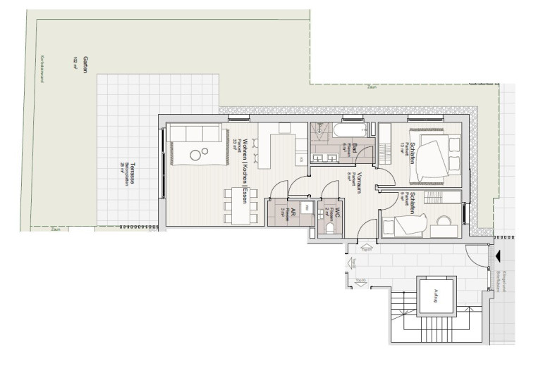 - Terrasse: ca. 28 m², Südwestausrichtung, mit frostsicherem Wasseranschluss