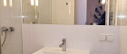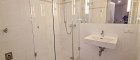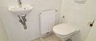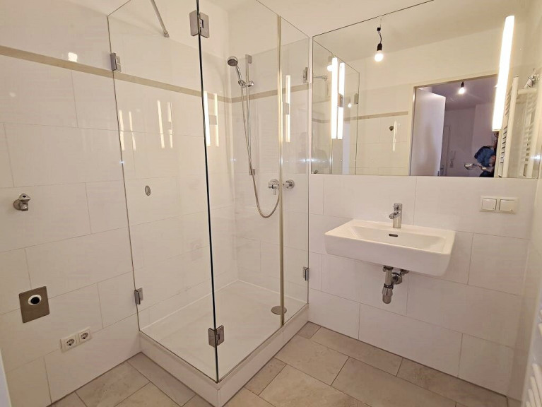 + Badezimmer mit Dusche, Waschtisch und Sprossenheizkörper