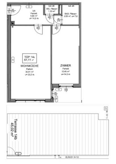 Vorzimmer, Wohnküche, Schlafzimmer, Badezimmer, separates WC, ca. 45,02 m2 Terrasse und Kellerabteil