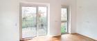 Linkerhand befindet sich das separate WC. Rechts öffnet sich der rund 27 m² große, helle Wohn-/Essbereich mit integrierter Küche und direktem Zugang zur großzügigen Terrasse. Auf der gegenüberliegenden Seite der Wohnung liegen zwei Schlafzimmer mit ca. 12,6 m² bzw. 12,1 m². Das Badezimmer ist mit einem Fenster und einer Dusche ausgestattet.