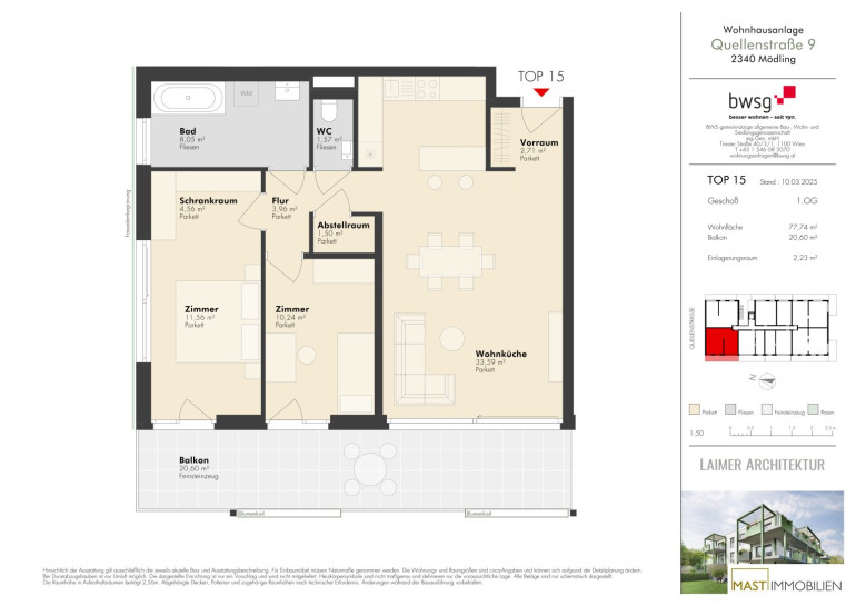 Die Wohnung befindet sich im 1. Obergeschoss und verfügt über 77,74 m² Wohnfläche + einen 20,60 m² großen Balkon.