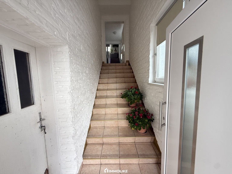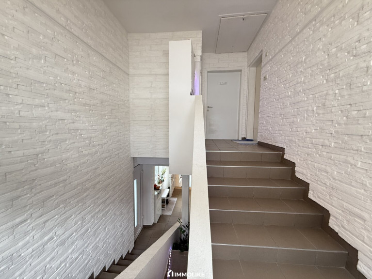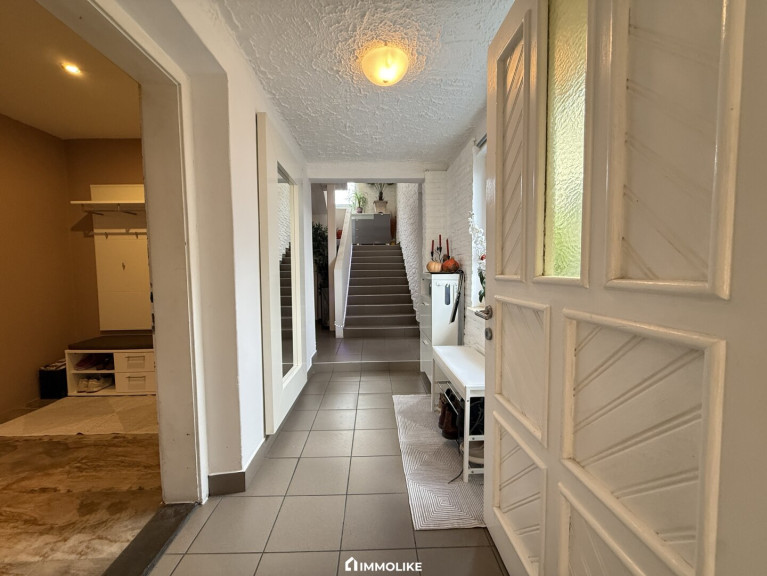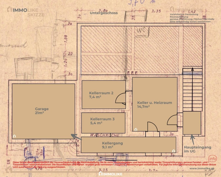 Hier befindet sich der Haupteingang. Von diesem Bereich gelangt man sowohl ins Kellergeschoss als auch über das Stiegenhaus in die Wohnetagen. Das Kellergeschoss umfasst drei Räume, von denen einer als Heizraum dient. Aktuell werden die Räume überwiegend als Lager genutzt, bieten jedoch bei kleinen Verbesserungen weiteres Nutzungspotential. Die integrierte Garage mit Tor eignet sich als Stauraum oder für Kleinfahrzeuge und Fahrräder – durch das Carport wird sie aktuell überwiegend als Abstellfläche genutzt.