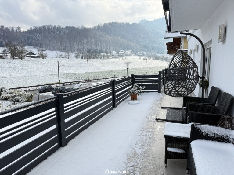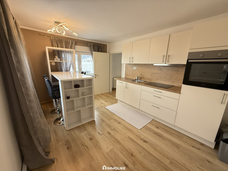 Optimale Raumaufteilung mit schönem Wohnzimmer und direktem Zugang zum Balkon (ca. 5,8 m²) samt Bergblick. Zusätzlich vorhanden: Küche mit Essbereich, Schlafzimmer und modern saniertes Badezimmer.