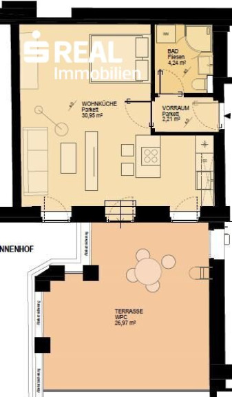 Es besteht aus einem ca. 31 m² großen Wohn/Schlafbereich mit modern möblierter Küche, einem modernen Bad mit Dusche, WC und Waschmaschinenanschluss, einem Vorraum und einer fast 27 m² großen Terrasse.