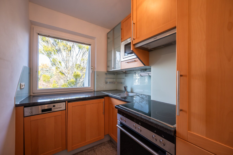 Das Wohnzimmer öffnet sich zur großartigen Süd/West-Terrasse, die einen wunderbaren Blick über die Dächer von Pötzleinsdorf, Gersthof und Währing bietet. Die Küche ist möbliert, funktional ausgestattet und verfügt über einen Waschmaschinenanschluss. Das Bad bietet eine Badewanne, WC, Waschtisch und einen Handtuch-Heizkörper. Insgesamt präsentiert sich die Wohnung in einem gepflegten Zustand, Sanierungsbedarf besteht allerdings am Wohnzimmerboden vor der Terrassentüre. Ein Kellerabteil ist der Wohnung zugeordnet.