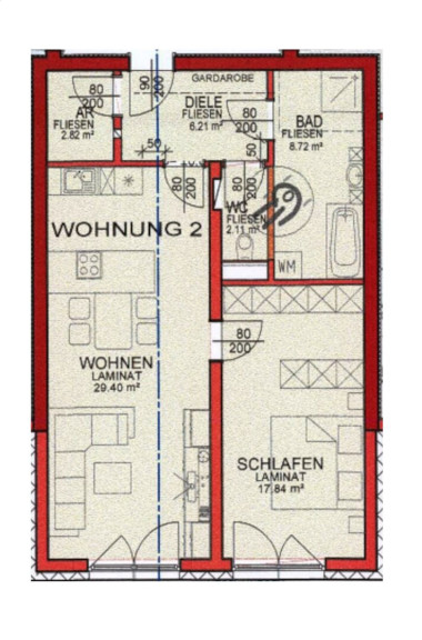 Die Zimmer sind mit 29,40 m² (Wohnküche) und 17,84 m² (Schlafzimmer) sehr großzügig geschnitten.