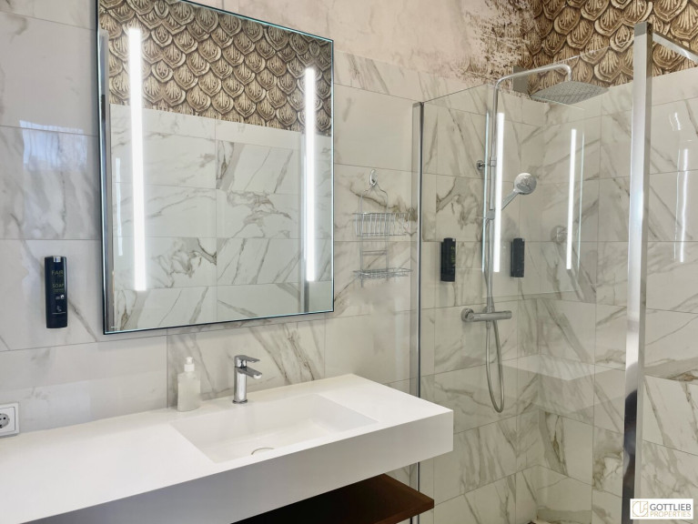 + Bad mit Dusche, Waschbecken und Handtuchwärmer