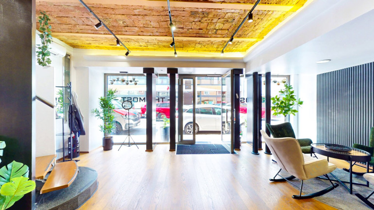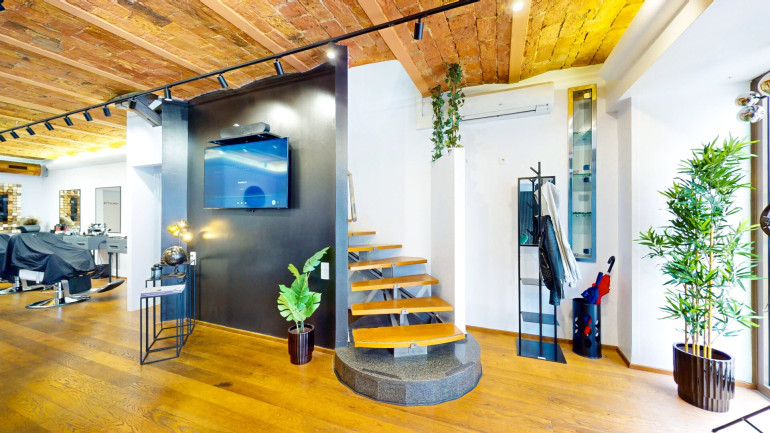 Der Zugang erfolgt wahlweise durch den Friseursalon oder über ein separates Stiegenhaus, was sowohl Diskretion als auch Sichtbarkeit ermöglicht – ideal für Dienstleister:innen im Beauty- und Gesundheitsbereich oder für Unternehmen mit individueller Kundenbetreuung.