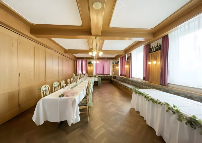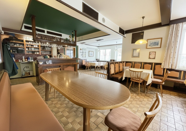 Der große Saal mit massivem Holzboden eignet sich ideal für Veranstaltungen, Feiern oder touristische Konzepte. Die Kombination aus Gastronomiebetrieb und Wohnmöglichkeit schafft flexible Nutzungsszenarien, vom klassischen Familienbetrieb bis zum modernen Betreiberkonzept.