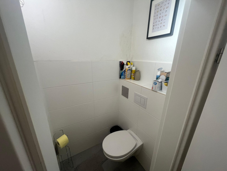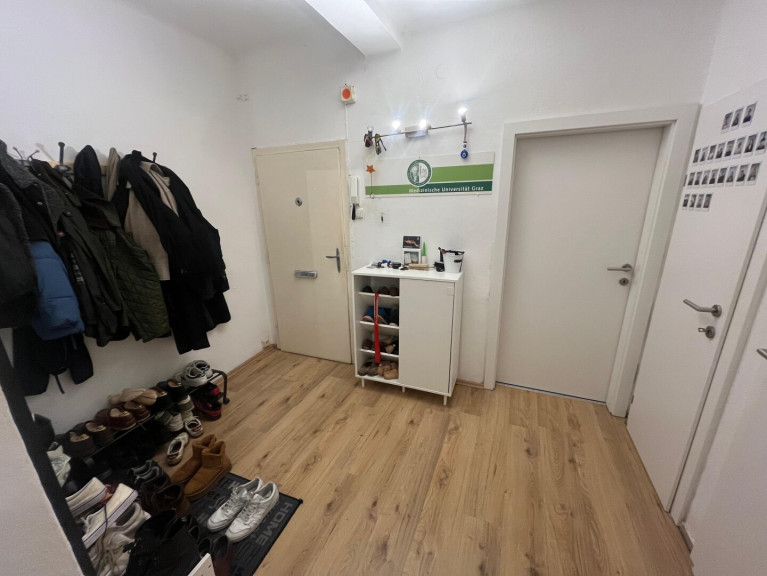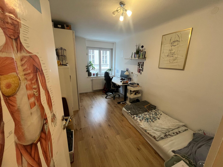 Das Badezimmer und das separate WC sind funktional angeordnet und bequem erreichbar. Ein eigenes Kellerabteil sorgt für zusätzlichen Stauraum, der im Alltag sehr praktisch ist. Abgerundet wird das Gesamtbild durch einen kleinen Gemeinschaftsgarten, der den Bewohnern zur Mitbenutzung zur Verfügung steht – eine seltene und charmante Ergänzung für eine Innenstadtlage.