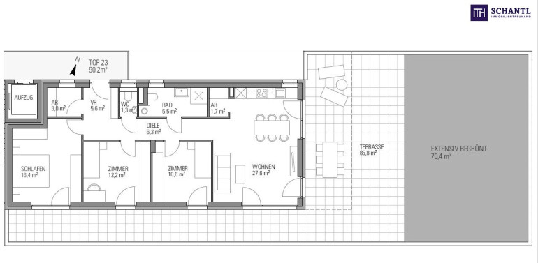 - eine Terrasse mit gigantischen 156m²., davon werden 70,4m² begrünt