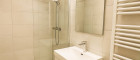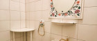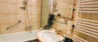 - Badezimmer mit Marmorwaschbecken, Wasserfall-Armatur, Badewanne und Waschmaschinenanschluss