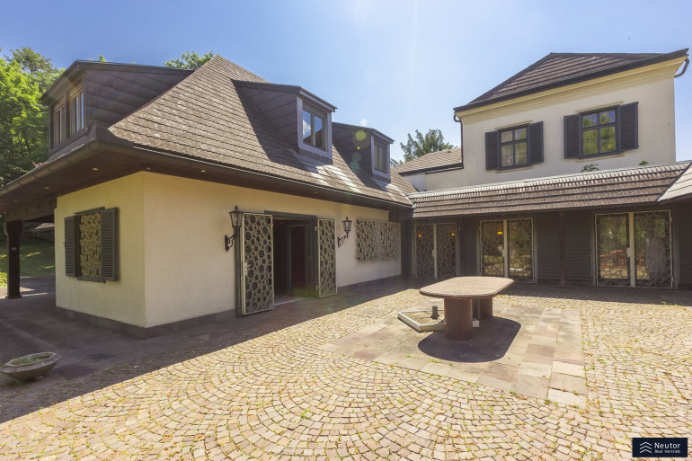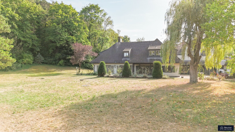 Diese traditionsreiche Villa in Perchtoldsdorf, gelegen auf einem beeindruckenden Grundstück von ca. 6.432 m², aufgeteilt auf drei Parzellen (eine durch den unterirdischen Saurüsselgraben geteilt), wurde nach höchsten Standards erbaut und vereint Großzügigkeit, Privatsphäre und stilvolle Wohnkultur. Beim Betreten führt ein großzügiger Vorraum als einladendes Entrée in das Anwesen, ergänzt durch eine separate Toilette im Eingangsbereich. Von hier öffnet sich der Zugang zum prächtigen Wohnzimmer, das durch seine Helligkeit und den direkten Zugang zum großen Garten besticht – ideal für gesellige Abende oder entspannte Stunden im Freien. Angrenzend liegt ein Speisezimmer, das sich perfekt für gemeinsame Mahlzeiten eignet, sowie eine funktionale Küche mit viel Gestaltungspotenzial. Im Erdgeschoss, das großteils mit hochwertigem Naturstein verlegt wurde, befindet sich zudem ein Badezimmer, das an ein einzelnes Zimmer angeschlossen ist, welches flexibel als Büro, Bibliothek oder Gästezimmer genutzt werden kann. Eine hauseigene Sauna sowie ein praktischer Hauswirtschaftsraum im Erdgeschoss unterstreichen den exklusiven Wohnkomfort. Über ein stilvolles Stiegenhaus gelangt man ins obere Stockwerk, wo zwei großzügige Schlafzimmer mit jeweils eigenem Badezimmer und begehbarer Garderobe für luxuriösen Komfort sorgen. Ein vielseitig nutzbares Nebengebäude mit Wohnküche, Zimmer, Badezimmer und separatem WC dient ideal als Gästehaus, Personalunterkunft oder Rückzugsort. Der weitläufige Garten mit altem Baumbestand und Wald schafft ein idyllisches Refugium – perfekt zum Entspannen oder für repräsentative Anlässe. Diese Liegenschaft ist ein wahres Schmuckstück für anspruchsvolle Käufer, die Exklusivität und den Charme Perchtoldsdorfs schätzen.