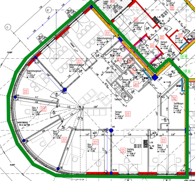Der Grundriss bietet 4 Büroräume, 1 Besprechungsraum, einen Empfangsbereich sowie eine Teeküche. Selbstverständlich können hier, je nach Ihren Bedürfnissen, Anpassungen vorgenommen werden.