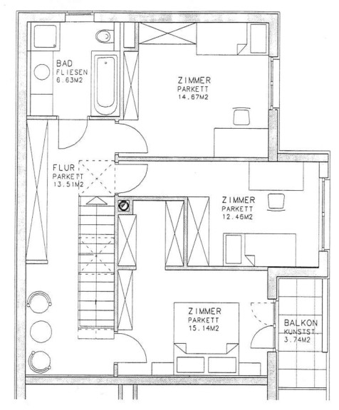 Fliesen, Parkett, Zentralheizung, Einbauküche, Personenaufzug, Badewanne