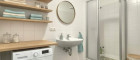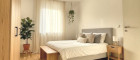 Ein helles Schlafzimmer schafft Raum für Erholung. Das Badezimmer verfügt über eine Dusche, ein Waschbecken und einen Waschmaschinenanschluss, das WC ist separat angelegt.