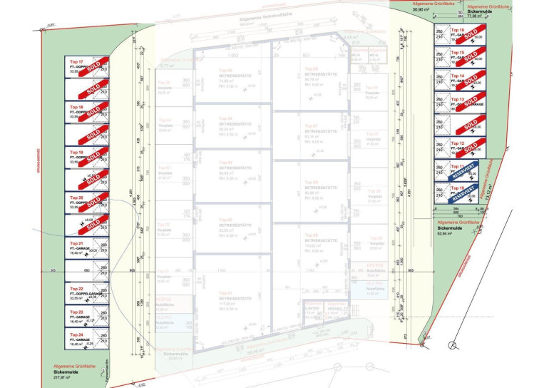 • Doppelgaragen mit Größen von 2x (300 x 600 cm) und 2x (300 x 700 cm), jeweils mit Durchbruch