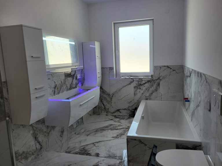 • Badezimmer möbliert mit Badewanne, Dusche, Doppelwaschtisch