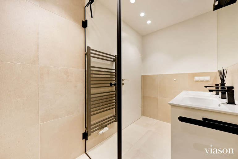 - ein saniertes Badezimmer mit Dusche und Doppelwaschbecken sowie Handtuchheizkörper,