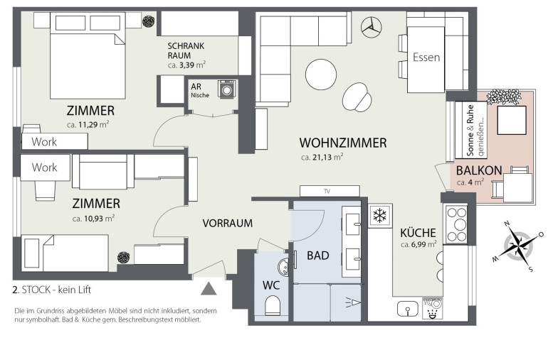 Die im 2. Stock (ohne Lift) gelegene Wohnung auf der Stiege 2 überzeugt durch ihren sehr durchdachten Grundriss die geschmackvolle Einrichtung und Ausstattung und eine positive Helligkeit. Die Wohnfläche von ca. 66,15 m² plus ein Balkon mit ca. 4 m² verteilen sie wie folgt: