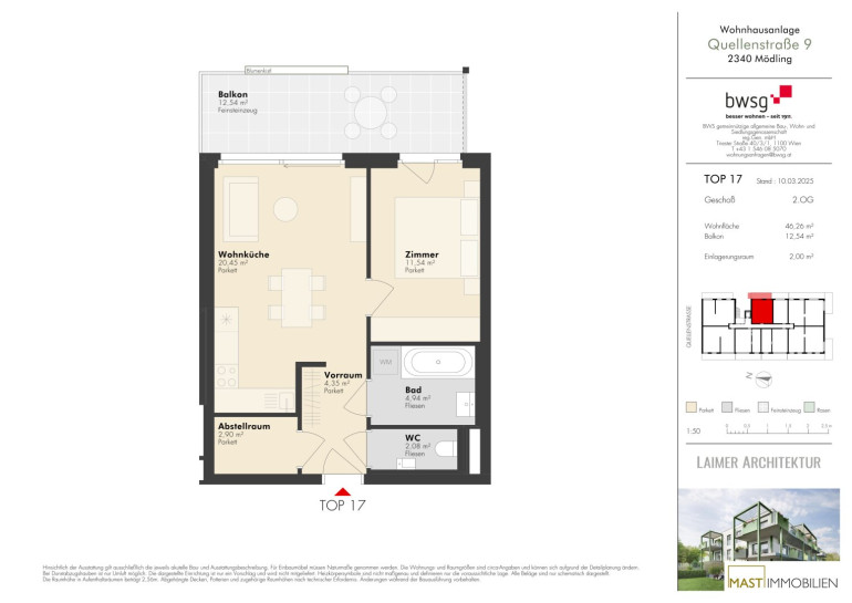 Die Wohnung befindet sich im 2. Obergeschoss (Dachgeschoss) und verfügt über 46,26 m² Wohnfläche + einen 12,54 m² großen Balkon.