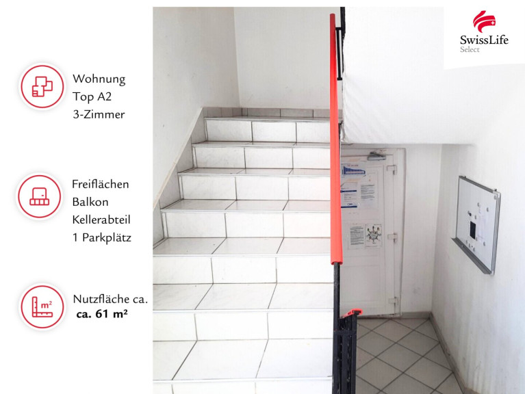 Top A2 - Obergeschosswohnung: Die Wohnung im ersten Obergeschoss verfügt über eine Nutzfläche von ca. 60,86 m² und ist eine klassische 3-Zimmer-Wohnung mit durchdachter Raumaufteilung. Der Balkon bietet einen schönen Ausblick und ergänzt den Wohnraum ideal. Die Wohnung ist aktuell befristet vermietet bis zum 31.03.2026. (Nettomietzins € 307,62 - Betriebskosten Akontozahlung € 530 - Gesamtbetrag 837,62)