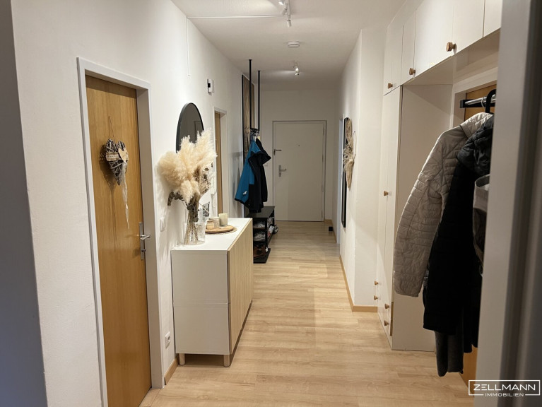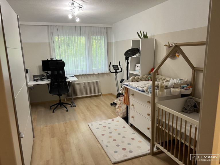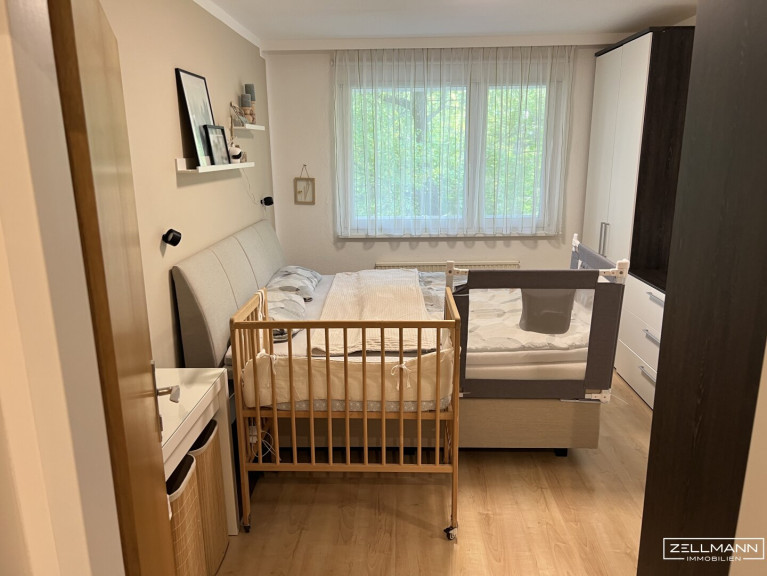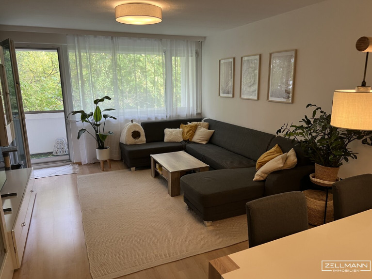 Bereits beim Betreten spürt man die Großzügigkeit: Ein einladender Vorraum eröffnet den Zugang zu allen Räumen – drei separat begehbare Zimmer, eine Küche mit Fenster, Bad, separates WC sowie ein praktischer Abstellraum. Besonders hervorzuheben ist das rund 26 m² große Wohnzimmer mit direktem Zugang zur Loggia, die einen herrlichen Blick ins Grüne bietet.