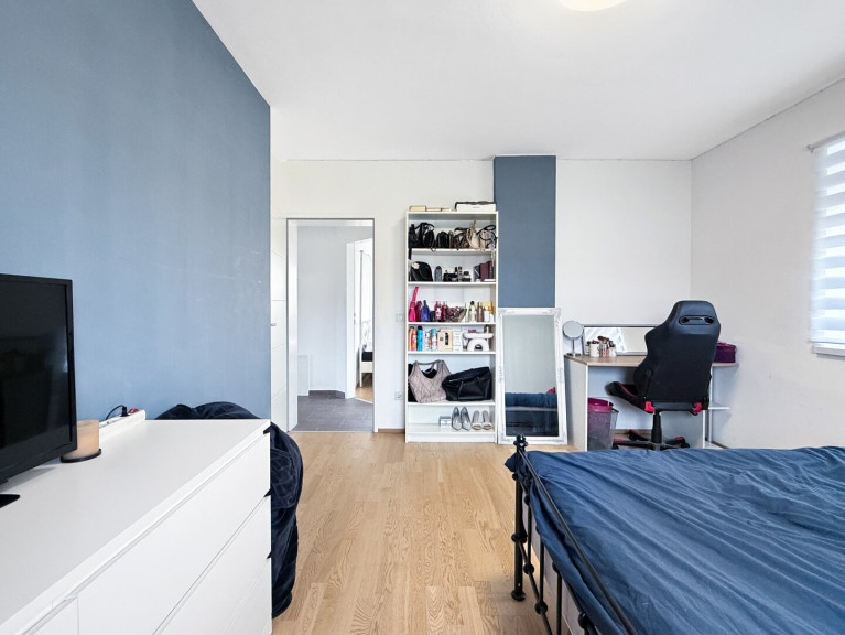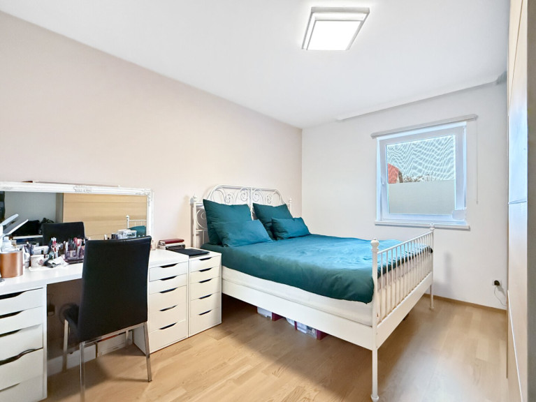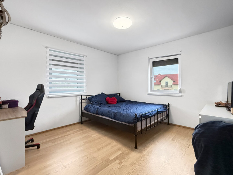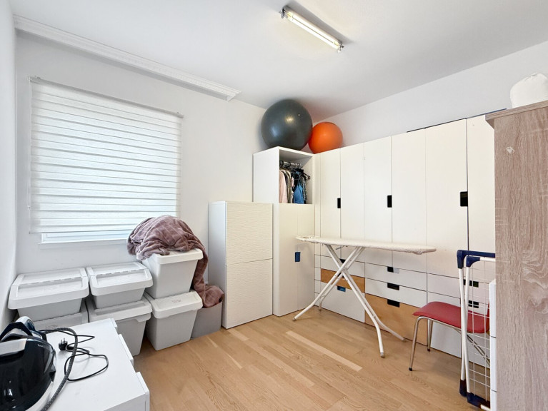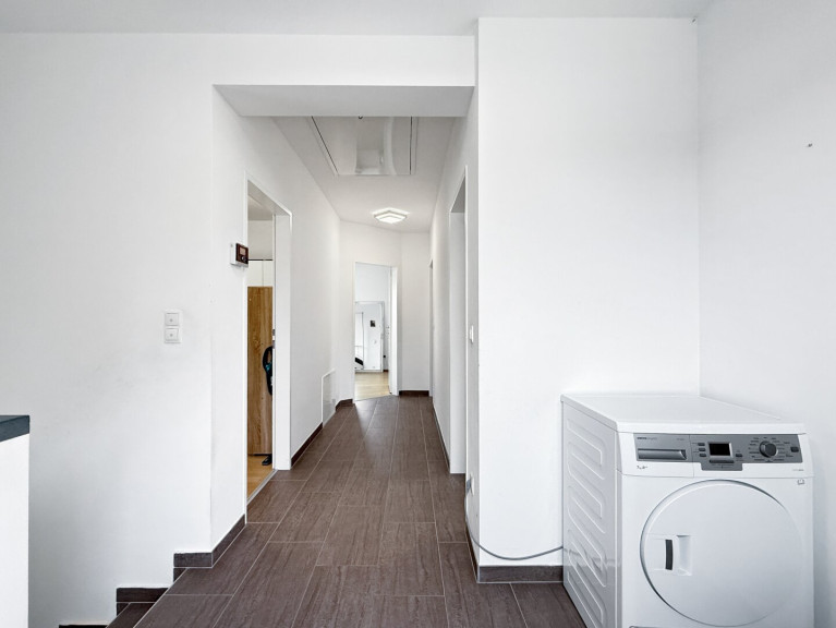 Über die Treppe im Eingangsbereich gelangt man in das Obergeschoss. Ein zentraler Gang erschließt alle Zimmer – darunter drei Schlafzimmer, ein großer Schrankraum, ein Badezimmer mit WC sowie ein Abstellraum, der das Raumangebot perfekt ergänzt.