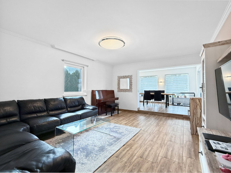 Geradeaus erreicht man den Gangbereich, von dem aus man rechterhand in das erste Zimmer gelangt. Weiter führt der Weg in den großzügigen Wohnbereich, der wiederum in die Küche und den angrenzenden Essplatz übergeht. Vom Essbereich aus hat man Zugang zur Terrasse, die sich hervorragend für gemütliche Stunden eignet.
