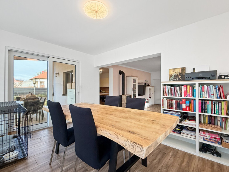 Ein echtes Highlight ist der liebevoll angelegte Garten, der von allen Seiten des Hauses zugänglich ist. Die überdachte Terrasse direkt neben dem Essbereich bietet idealen Platz für gemütliche Familienfeiern. Ein Grillplatz sowie mehrere Hochbeete schaffen perfekte Bedingungen für Gartenliebhaber und Grillmeister.