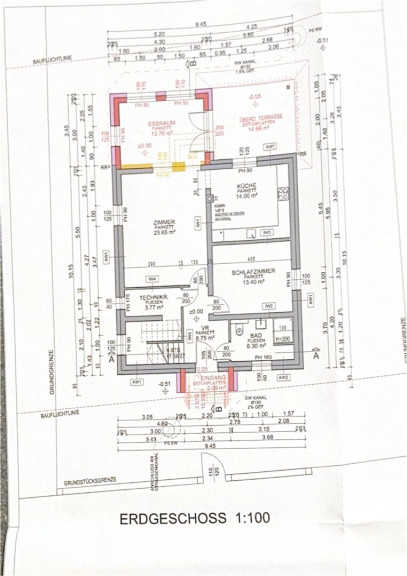Erdgeschoss: Eingangsbereich, Vorzimmer, Badezimmer mit WC, Küche, großer Wohnbereich, Esszimmer, Schlafzimmer