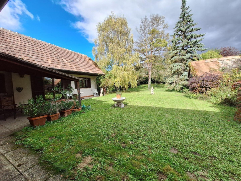 Hinter dem Haus liegt der ca. 1200 m² große, von außen uneinsehbare, ebene Garten mit vielen Bäumen und einem urigen Weinkeller.