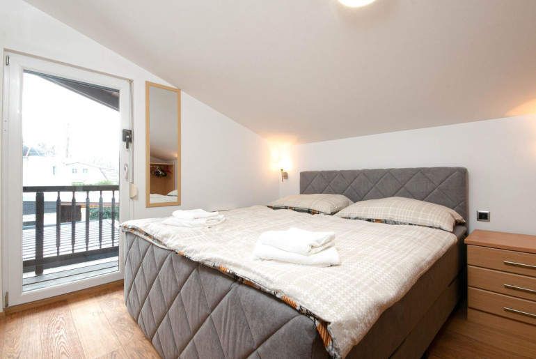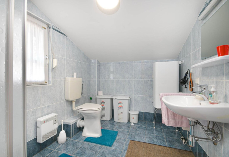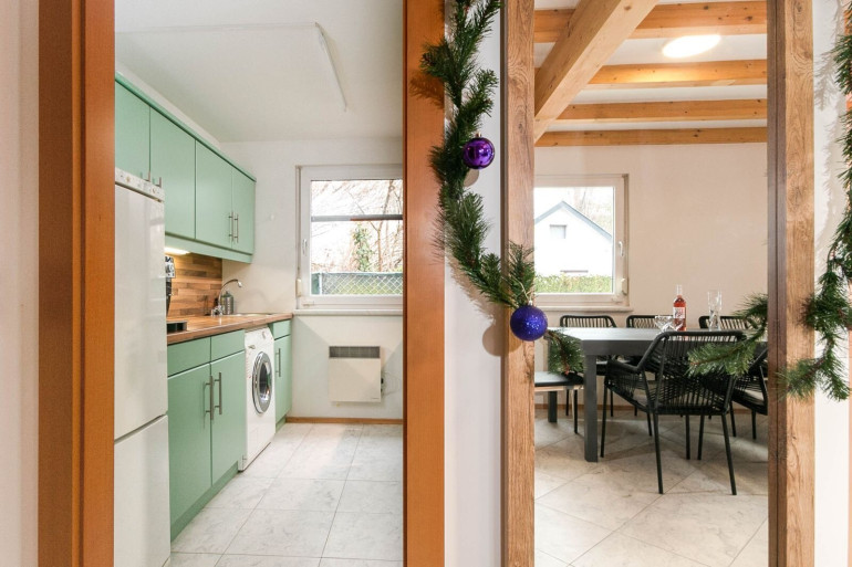The bright living and dining area opens onto a covered terrace and provides a pleasant atmosphere. The kitchen is fully equipped and offers everything needed for daily living. On the upper floor you will find two comfortable bedrooms with good storage space. The house has one bathroom and two WC.