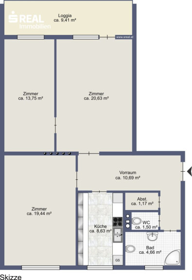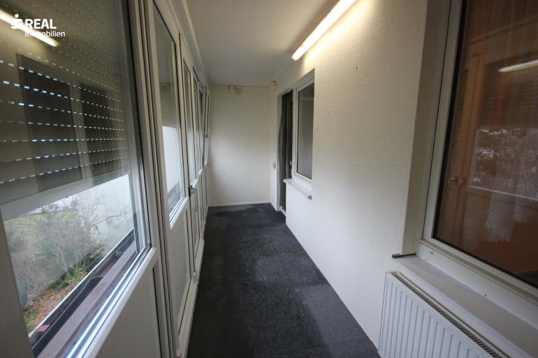 Die Wohnung ist vom Vorraum aus teilweise zentral begehbar und bietet ein getrenntes Bad und WC, einen Abstellraum, eine geräumige Küche, ein ca. 21 m² großes Wohnzimmer mit Ausgang auf die Süd-Loggia sowie zwei Schlafzimmer.