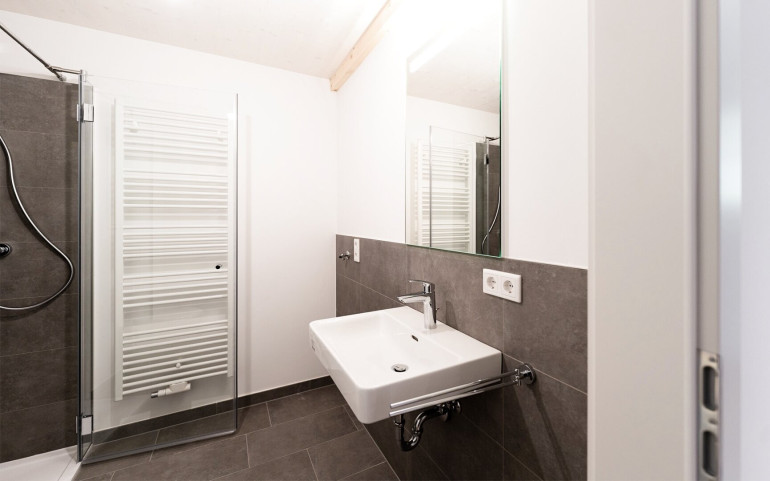 - Bad: Dusche, Waschtisch, Handtuchtrockner, LED-Spiegel, Grohe Armaturen, Waschmaschinenanschluss, WC