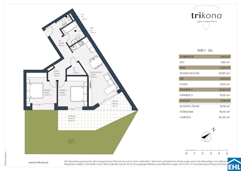 Die hochwertige Ausstattung des Projekts „Trikona“ und die energieeffiziente, innovative Holz-Hybrid-Bauweise spiegeln exzellentes Design und Qualität wider. Zeitlose Unterputzarmaturen der Firma Grohe sorgen für eine elegante Optik und praktische Nutzung. Das Weitzer Echtholzparkett schafft eine warme, natürliche Atmosphäre in den Räumen, während die moderne Smart Home Anlage das Wohnen komfortabel und intelligent macht – von der Steuerung der Beleuchtung bis hin zu Heizung und Sicherheitssystemen. Für Energieeffizienz sorgen eine Wärmepumpe mit Fußbodenheizung sowie eine innovative Kühlung via Roll Over System, die das ganze Jahr über für angenehme Temperaturen sorgt. Hochwertige Feinsteinfliesen im Badezimmer und in der Küche verleihen den Räumen einen eleganten, pflegeleichten Look. Echtholzböden ergänzen das harmonische Gesamtbild und unterstreichen die Qualität der Ausstattung. Besonders hervorzuheben ist, dass alle verwendeten Materialien, Marken und Subunternehmen aus Österreich stammen. Damit wird nicht nur höchste Qualität garantiert, sondern auch die lokale Wirtschaft nachhaltig unterstützt. Diese Kombination aus österreichischer Handwerkskunst, Ästhetik und Funktionalität macht das Wohnerlebnis in „Trikona“ einzigartig.