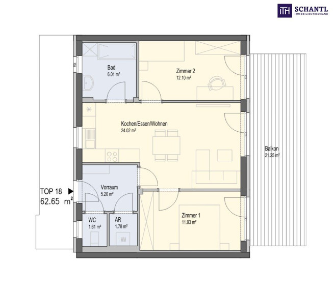 • 62,80 m² Wohnfläche + 21,25 m² Südostbalkon