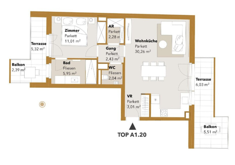 Jede Wohnung ist nicht nur mit einer Freifläche ausgestattet, sondern weißt auch hochwertige Materialien als auch Ausstattung aus: