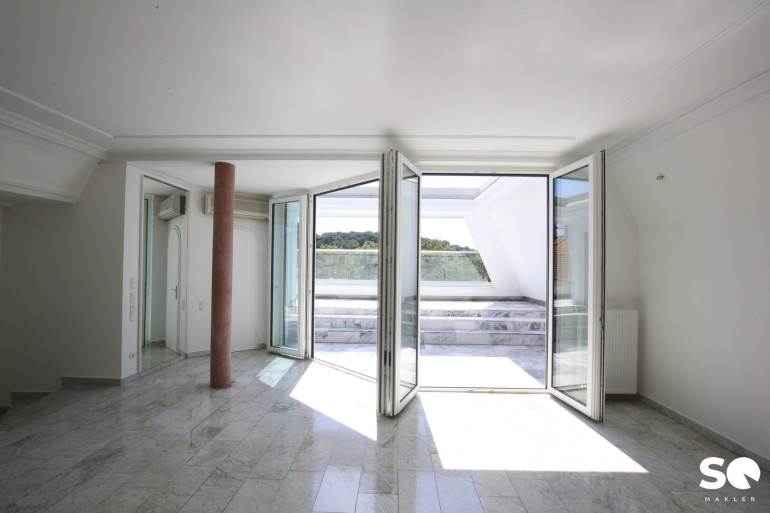 Das Herzstück dieser einzigartigen Wohnung ist die ca. 27 m² große, uneinsehbare Südterrasse, die Ihnen einen traumhaften Weitblick Blick Richtung Hügelpark und auf den Küniglberg bietet.