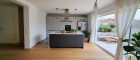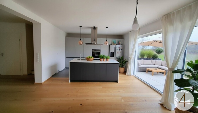In der unteren Etage befindet sich ein geräumiges Wohnzimmer, das nahtlos in den Essbereich übergeht. Diese offene Gestaltung fördert die Kommunikation und schafft einen einladenden Raum für Familien und Gäste. In Ihrer zukünftigen Küche können Sie ideal für die Zubereitung von Speisen sorgen, und bietet gleichzeitig Zugang zu einer Terrasse mit Gartenbereich, der zum Entspannen und Verweilen einlädt. Große Fensterfronten sorgen für eine helle und freundliche Umgebung, während die offenen Wohnkonzepte sowohl Funktionalität als auch Stil vereinen.