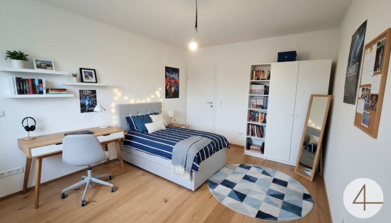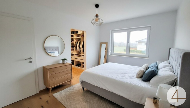Im Obergeschoss finden sich die Schlafräume, die individuell gestaltet werden können. Diese Räume sind lichtdurchflutet und bieten ausreichend Platz für Möbel und persönliche Gestaltungselemente. Ein modernes Badezimmer mit hochwertigen Sanitäreinrichtungen sorgt für Komfort und Wohlbefinden.