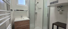Das Badezimmer ist mit einer Dusche und Fenster ausgestattet und ist vom WC getrennt.