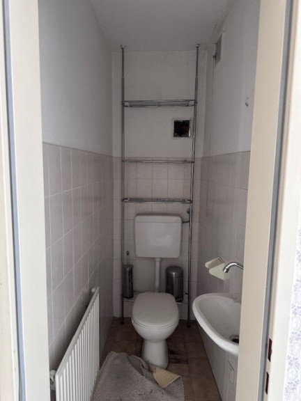 Die Ausstattung umfasst ältere Fliesen, einen Fertigparkett und eine in die Jahre gekommene Badewanne. Die Toilette ist separat und bietet zusätzlichen Komfort.