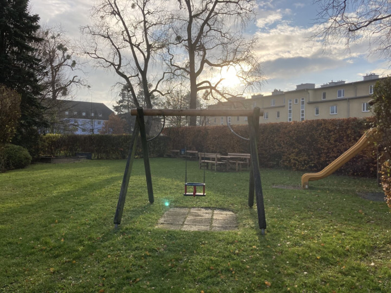 allgemeiner Garten: Grüner Innenhof mit Spielplatz und Gartenbänken – perfekt für Entspannung und Freizeit