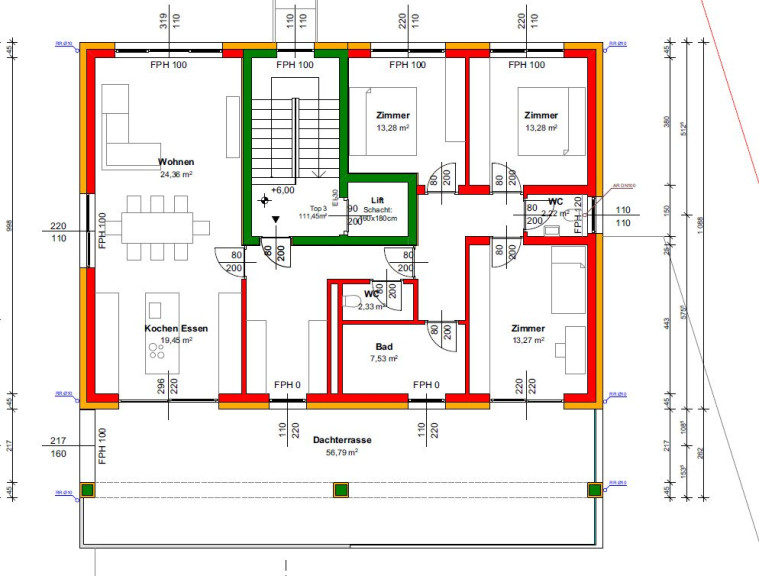 Vorraum - Küche - Wohnzimmer- Bad mit Dusche und WC- separates WC - Schlafzimmer - Kinderzimmer/Büro - Hobbyraum/Büro - 56 m² Dachterrasse - Abstellraum
