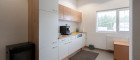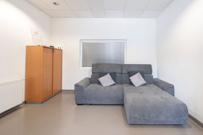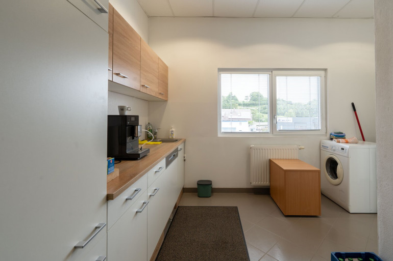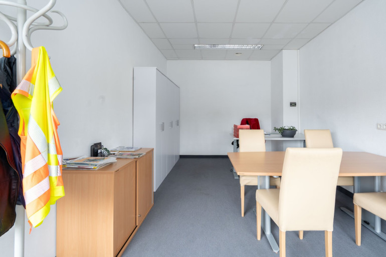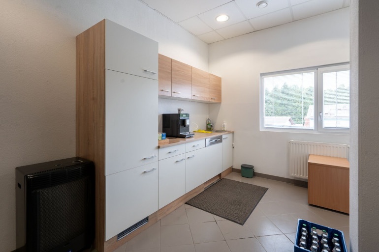 Das Büro im Erdgeschoss ist hell und funktional geschnitten und kann optimal für Verwaltung, Empfang oder Kundenkontakt genutzt werden. Das Obergeschoss-Büro überzeugt durch einen großzügigen Schnitt und die integrierte Küche, die als Pausen- oder Besprechungsbereich dient und den Arbeitsalltag komfortabel gestaltet. Sanitäre Einrichtungen für Damen und Herren befinden sich in der Gewerbehalle und stehen den Mietern beider Büros zur Verfügung.