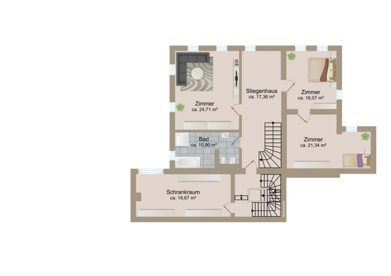 - 3 Schlafzimmer, 1 Schrankraum, Bad/WC und Stiegenhaus