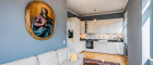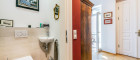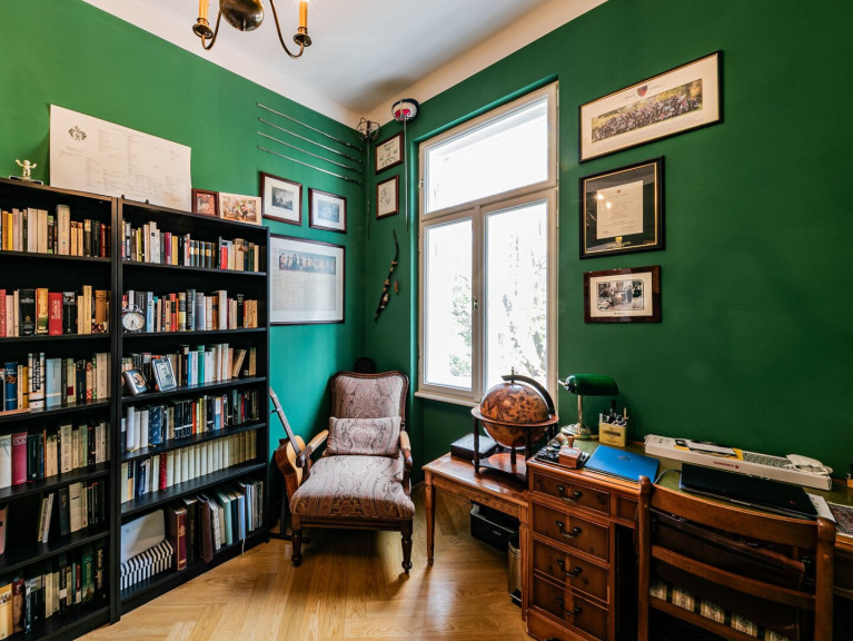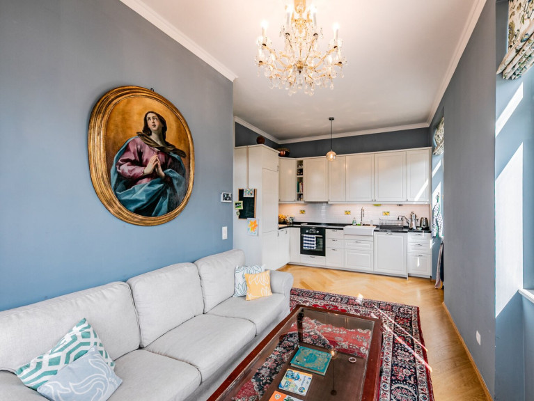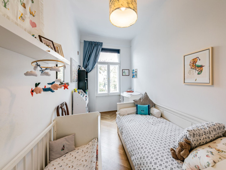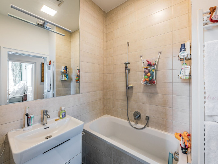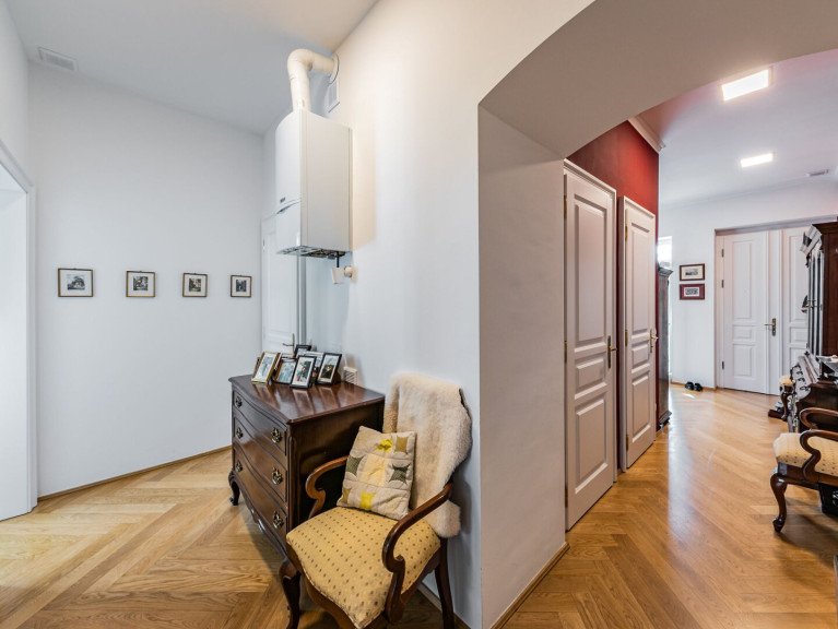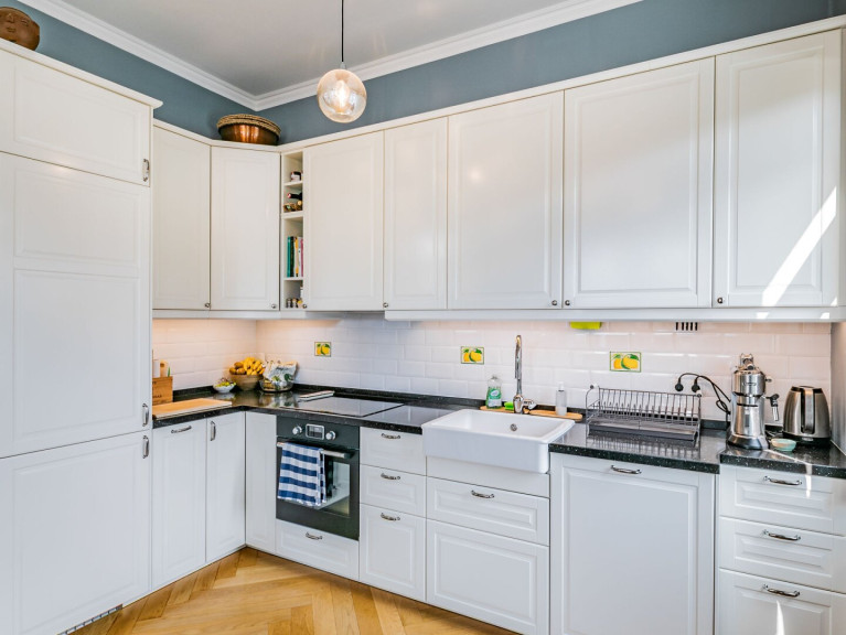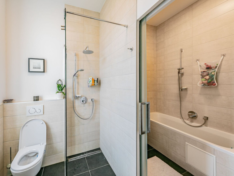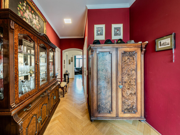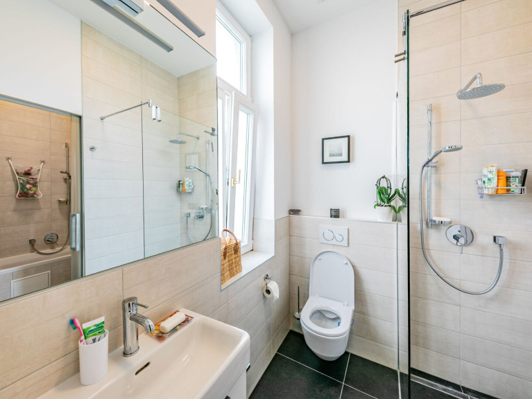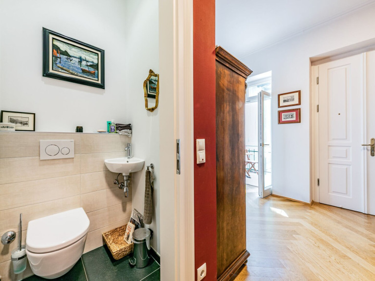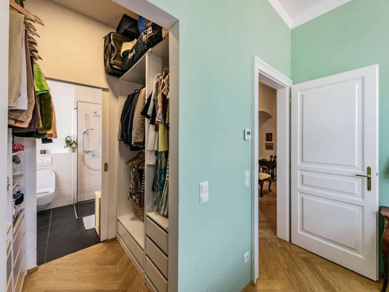 Herzstück ist die großzügige Wohnküche als geselliger Mittelpunkt. Drei getrennt begehbare Zimmer erlauben flexible Nutzung – ob als Schlafzimmer, Arbeits- oder Kinderzimmer. Ein Balkon bietet zusätzlichen Freiraum. Der begehbare Schrankraum sorgt für praktischen Komfort und Stauraum. Besonders hervorzuheben sind die zwei Badezimmer, die durch eine Schiebetür verbunden sind – ein Detail, das sich in klassischen Altbauwohnungen nur selten findet.