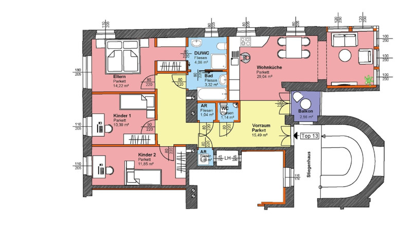 - 3 getrennt begehbare Zimmer (eines mit Schrankraum)