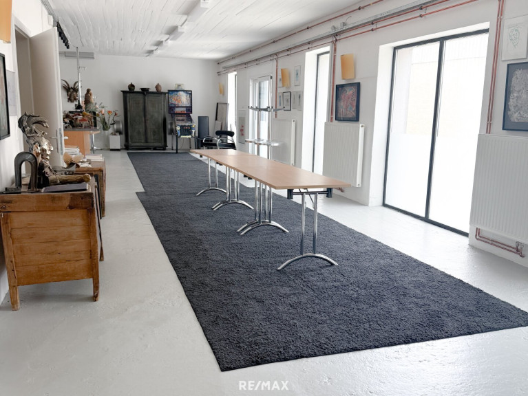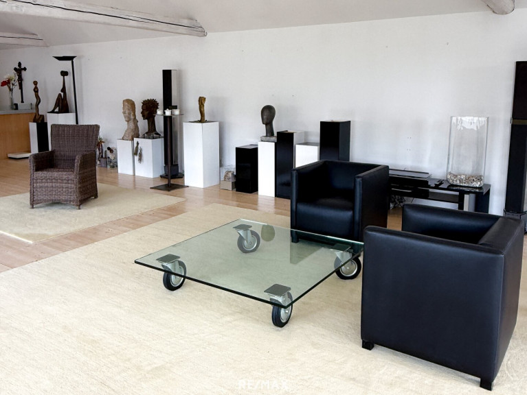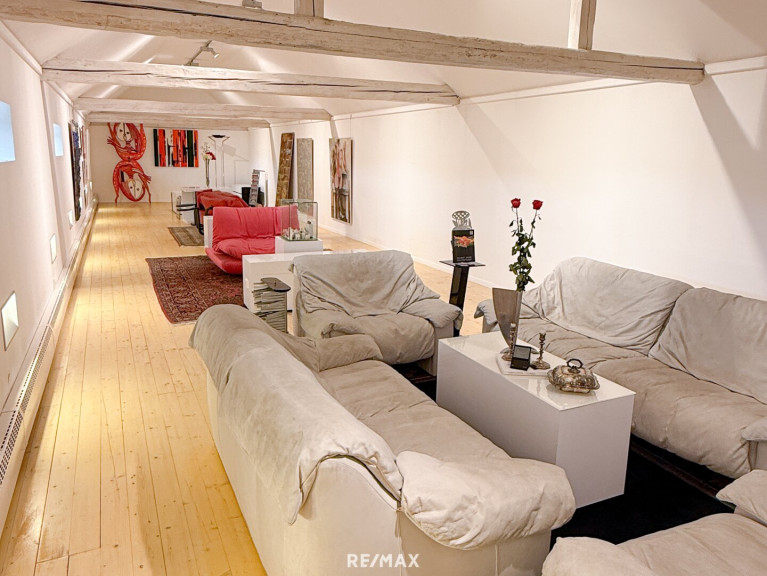 Das Haus verfügt über großzügige Flächen, die sich ideal als Ausstellungsräume oder Atelier eignen. Die offene Gestaltung ermöglicht eine flexible Nutzung – ob als Galerie, Wohnraum oder beides in einem.